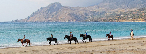 Langsamen Schrittes geht es von der Pferdefarm vorbei an Olivenhainen und kleinen Weideflächen hinunter ans Meer. Erstes Etappenziel ist der Damnoni Strand, eine lange Bucht mit wundervollem türkisen Wasser und weichem weißen Sand. Toll ist das Gefühl durch den pulvrigen Sand und entlang der Meereswellen zu reiten. Dann geht es weiter nach Osten entlang der Küste in Richtung Ammoudi Strand, wo sich Pferd und Reiter eine kurze Rast gönnen. Der Ausblick auf die Küstenlandschaft von Südkreta und auf das Lybische Meer ist fantastisch. Der Weg zurück zur Farm zeigt das Panorama der Berge rund um Plakias, allen voran die Weissen Berge, die normalerweise noch bis Juni schneebedeckt sind.