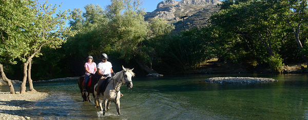 Der Ausritt startet in östlicher Richtung hinauf in die Berge von Plakias. Durch die Wasserquelle Avlaka, ist die Gegend mit sattem Grün überzogen. Der Ritt durch diese üppige Vegetation läßt ds Herz eines jeden erfahrenen Reiters höher schlagen.