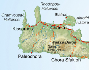 In der Region Chania liegen die weithin sichtbaren Weißen Berge. Oft sind sie noch bis in den Juni hinein mit Schnee bedeckt. Für den Tourismus wird in der Region Chania für alle Bedürfnisse etwas geboten.