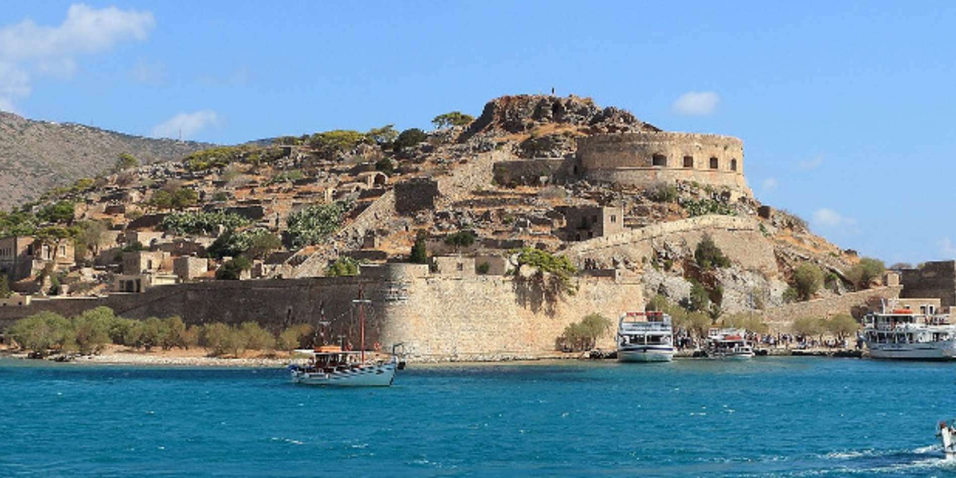 Von hier hier unternehmen Sie den Bootsausflug auf die Leprainsel Spinalonga. Im 15. Jahrhundert errichteten die Venezianer auf Spinalonga eine Burg. Berühmt oder bekannt geworden ist die Insel durch die Leprastation. Alle Bewohner von Kreta die an Lepra erkrankt waren wurden dorthin verbannt. Die Leprastation konnte in den 60er Jahren dank wirksamer Lepramittel geschlossen werden. Die ehemaligen Wohnhäuser, Krankenhaus und Kirchen sind erhalten und können besichtigt werden.